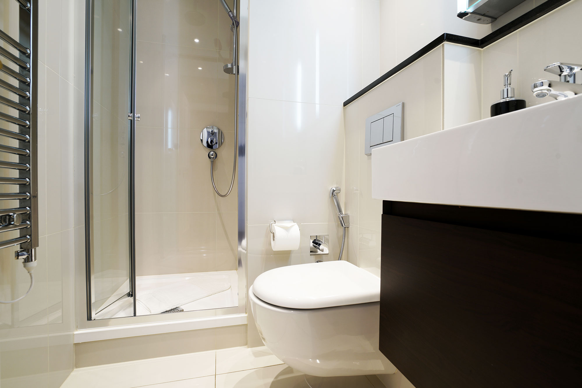 The Master Bedroom includes a Queen-size bed, and the second Bedroom has twin beds. Two Bathrooms that include one with bath and the other with power shower. An extra foldout bed can be provided, if required. The apartments are located on the 2nd and 3rd Floor.